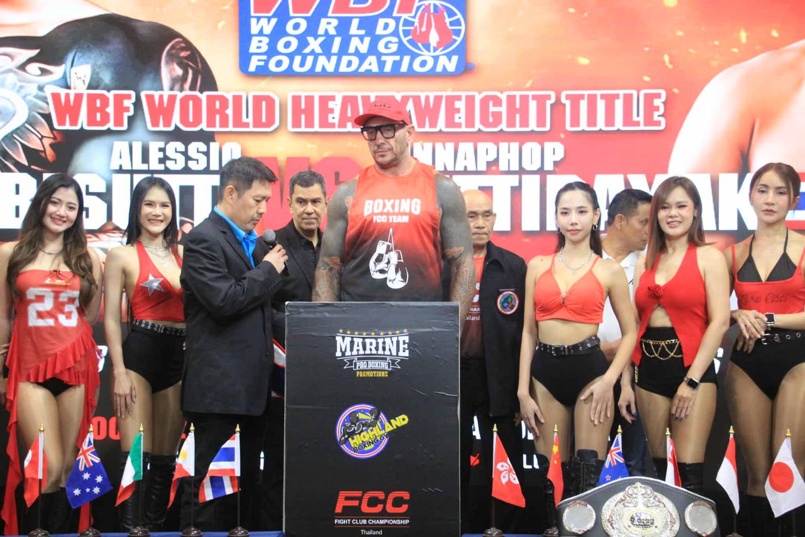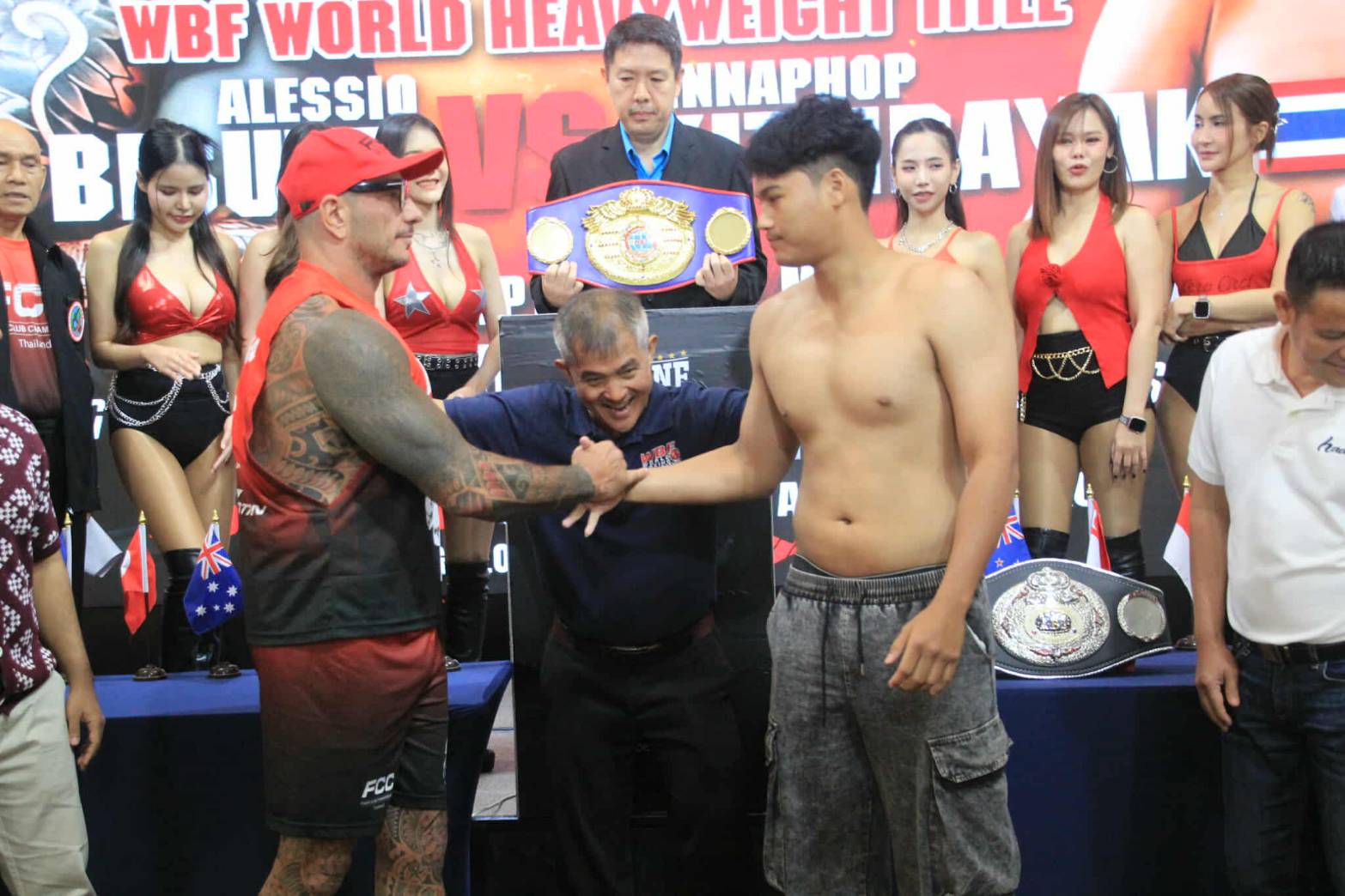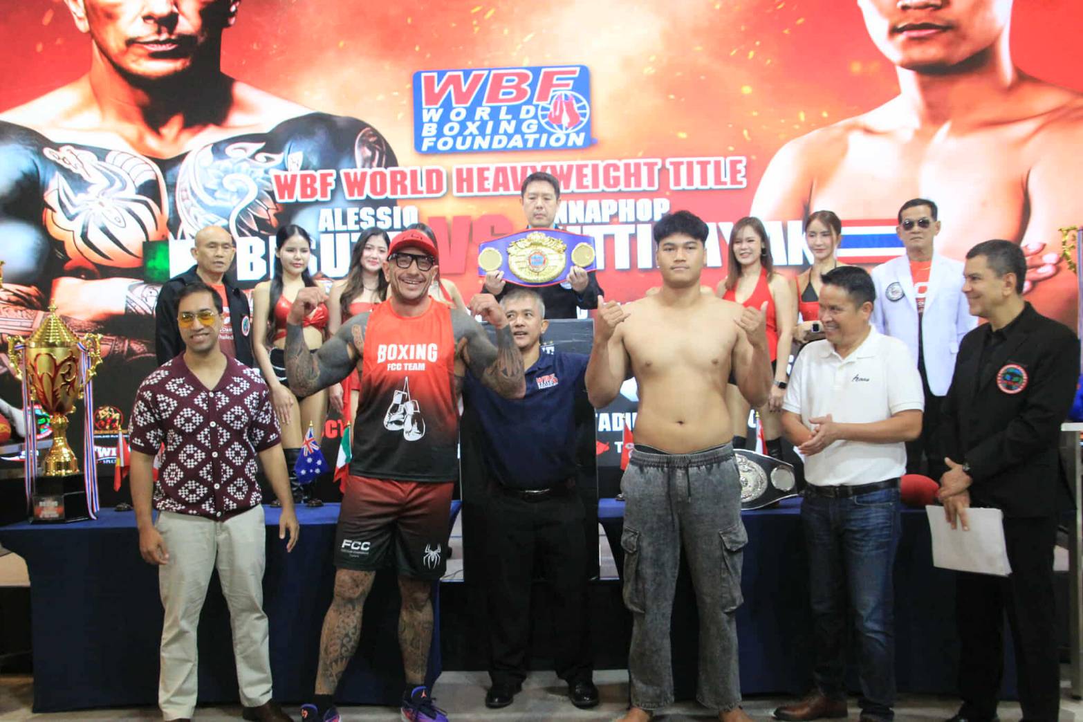 คู่ไฮไลต์ดวลเดือด ศึกป้องกันเข็มขัดแชมป์โลก WBF WORLD รุ่นเฮฟวี่เวท 200 ปอนด์ (10 ยก) ระหว่าง “อเลสซิโอ บิสซุตติ” เจ้าของเข็มขัดแชมป์ WBF WORLD นำเข็มขัดแชมป์ขึ้นไปเดิมพันเผชิญหน้ากับผู้ท้าชิง “ทินภพ กิตติพยัคฆ์” นักชกไทย ทั้งคู่พร้อมขึ้นสังเวียนดวลหมัดให้ชมกันแบบดุเดือด