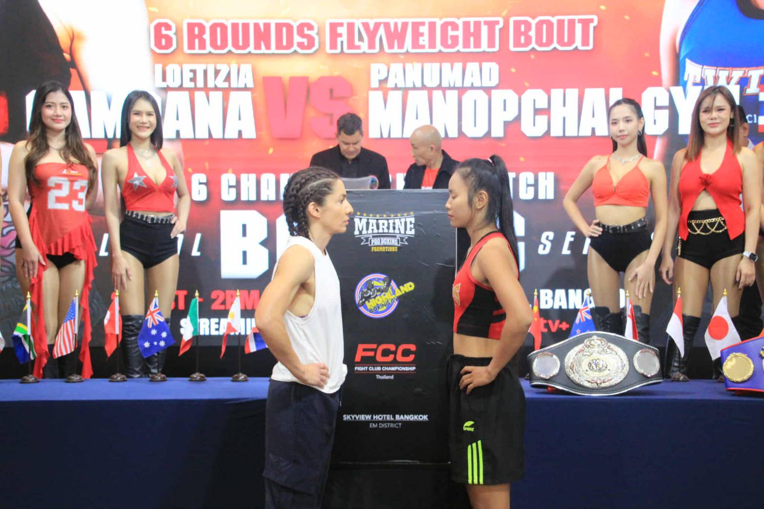 คู่ที่ 9. มวยหญิงชกอุ่นเครื่อง (6 ยก) รุ่นฟลายเวท พิกัด 112 ปอนด์ ระหว่าง โลเอติเซีย คัมพาน่า นักชกจากฝรั่งเศส ปะทะ ปัณมาศ มโนชัย ยิม นักชกไทย