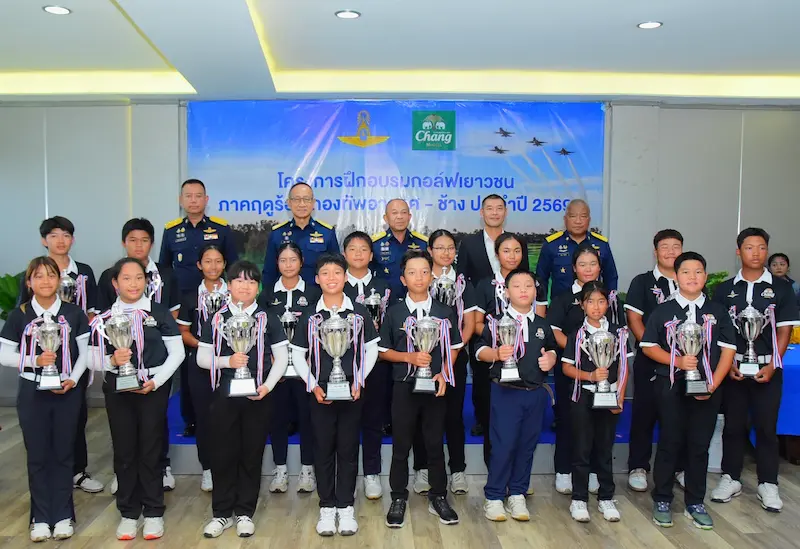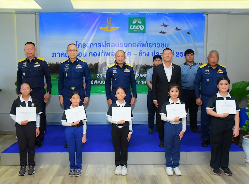 พลอากาศเอก ชาตินนท์ สท้านไผท ประธานอนุกรรมการศูนย์กีฬากองทัพอากาศ ดอนเมือง และหัวหน้าคณะทำงานโครงการฝึกอบรมกอล์ฟเยาวชนภาคฤดูร้อน “ช้าง – กองทัพอากาศ” พร้อมด้วยคุณภาสวร ปีตรังสี ผู้จัดการอาวุโสโครงการกีฬาเพื่อความเป็นเลิศ ไทยเบฟ ไทยทาเล้นท์ บริษัท ไทยเบฟเวอเรจ จำกัด (มหาชน) โดยน้ำแร่ธรรมชาติตราช้าง และแขกผู้มีเกียรติ เข้าร่วมพิธีปิดโครงการฝึกอบรมกอล์ฟเยาวชนภาคฤดูร้อน “ช้าง – กองทัพอากาศ” ประจำปี 2569 ณ ห้องชัยพฤกษ์ สนามกอล์ฟธูปะเตมีย์ เมื่อวันก่อน