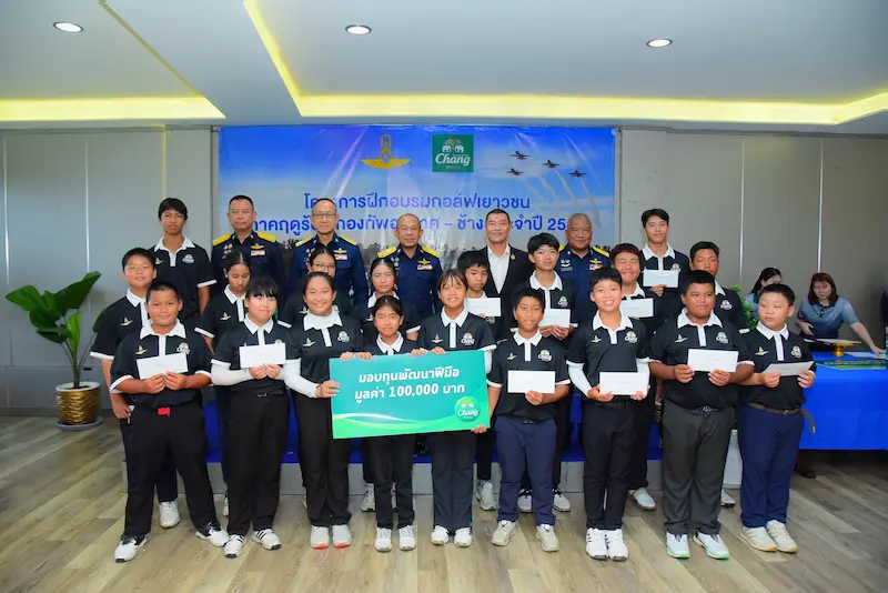 สำหรับโครงการฝึกอบรมกอล์ฟเยาวชนภาคฤดูร้อน “ช้าง – กองทัพอากาศ” ประจำปี 2569 ในปีนี้ ถือว่าประสบความสำเร็จเป็นอย่างมาก โดยมีน้อง ๆ นักกอล์ฟเยาวชนเข้าร่วมอบรมทั้งสิ้น 200 คน เราได้เห็นน้อง ๆ หลายคนมีพัฒนาการด้านกีฬากอล์ฟที่เติบโตแบบก้าวกระโดด แสดงให้เห็นถึงความเข้มข้นของหลักสูตรต่าง ๆ ความทุ่มเทของผู้ฝึกสอน และความมุ่งมั่นตั้งใจของน้อง ๆ ที่เข้าร่วมอบรม “น้ำแร่ธรรมชาติตราช้าง” จึงขอมอบทุนพัฒนาฝีมือ จำนวน 20 ทุน ทุนละ 5,000 บาท รวมทั้งสิ้น 100,000 บาท เพื่อให้น้อง ๆ นำไปต่อยอดในการเรียนรู้ ฝึกซ้อมและพัฒนาตนเองอย่างต่อเนื่อง เพื่อก้าวสู่การเป็นโปรกอล์ฟในอนาคต